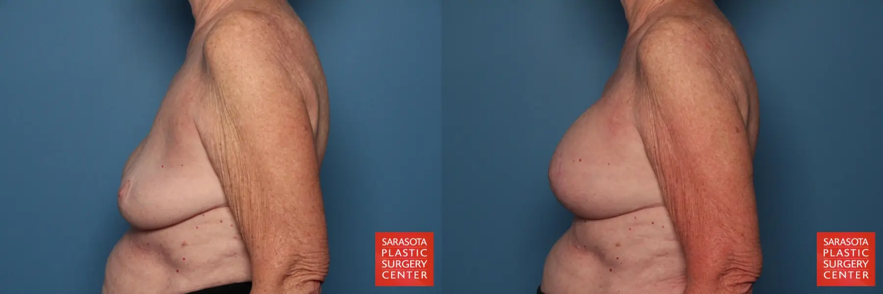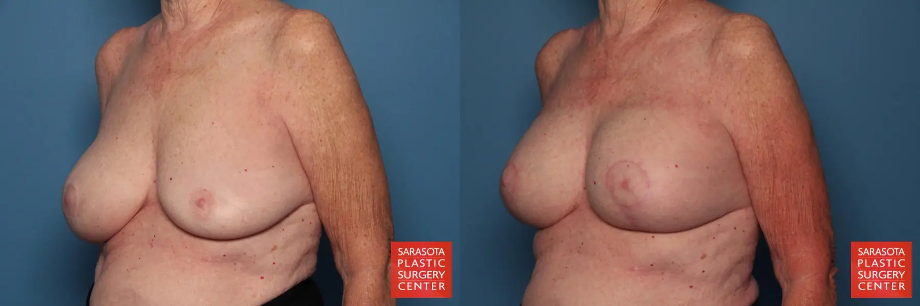 75-year-old female with a deflated left style 68 high-profile 400 mL inamed saline implant. She was also concerned with the drooping of her breasts.The patient chose to undergo a vertical mastopexy, implant exchange from saline to silicone Natrelle Inspira Style SRF 295cc, capsulorrahphy, and Galaflex mesh for tissue support.