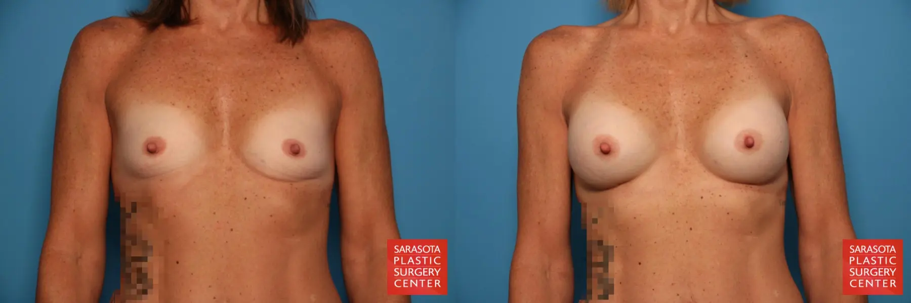 51-year-old mother of three that was concerned with her small and droopy breasts. She was a 34 A and desired to become a 34 B. The patient chose to undergo a bilateral submuscular breast augmentation using Natrelle Inspira silicone implants 220cc.