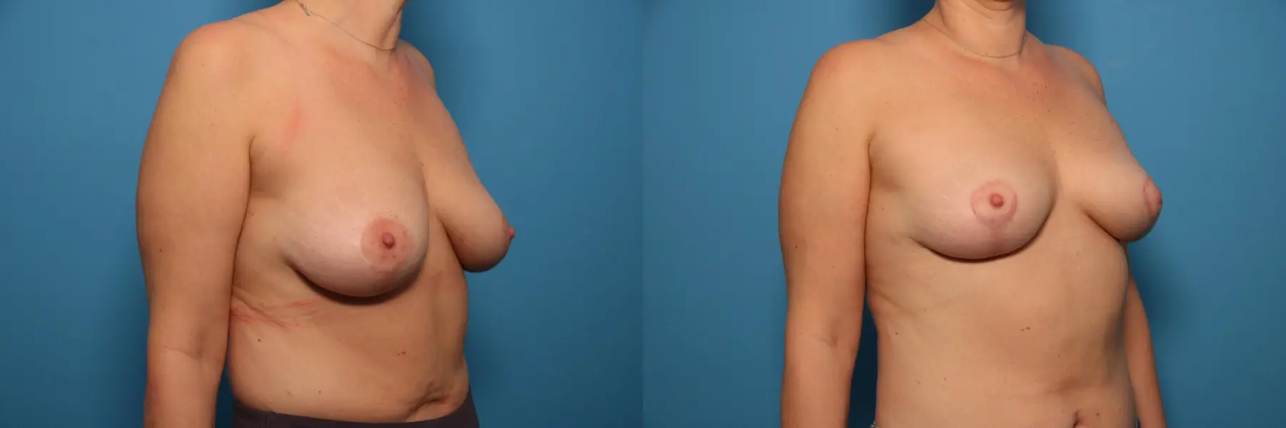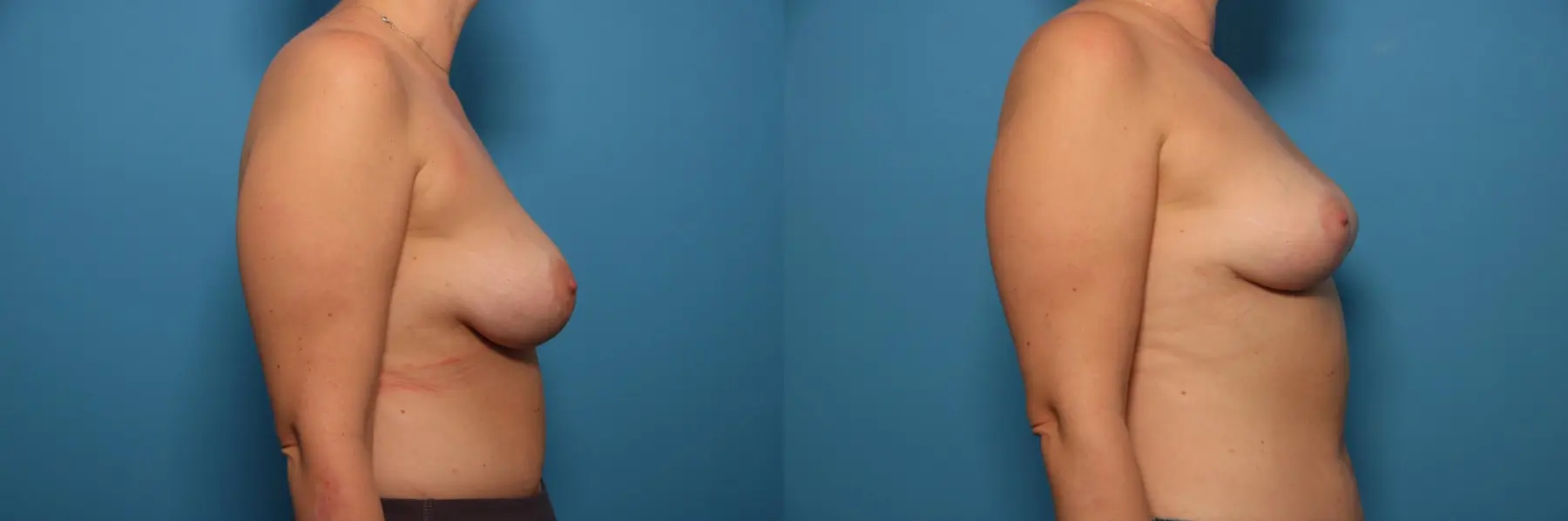 40-year-old female that underwent a submuscular saline breast augmentation in 2009. The patient felt her implant size was too big and wished to be smaller. In 2016 she chose to have her saline implants deflated in preparation for additional surgery but was unable to proceed due to personal reasons. Now 2018 the patient chose to remove her breast implants, bilateral mastopexies and liposuction to her upper abdomen.