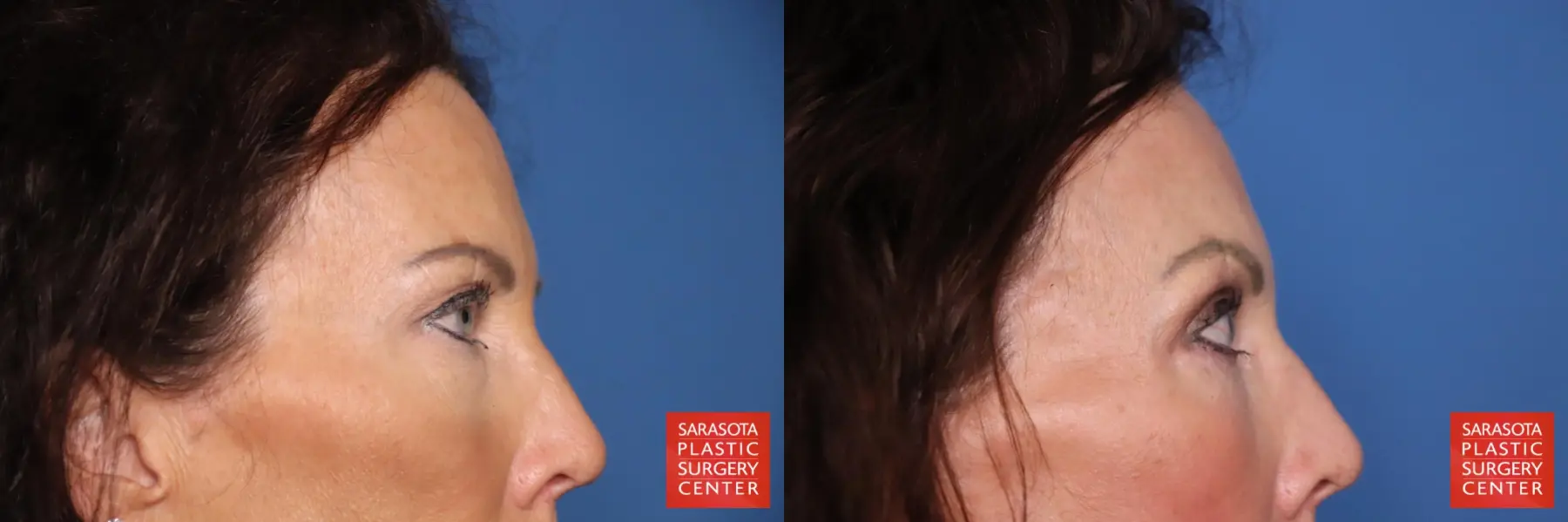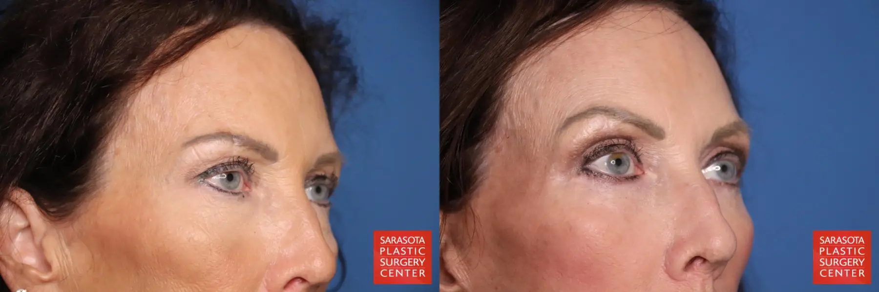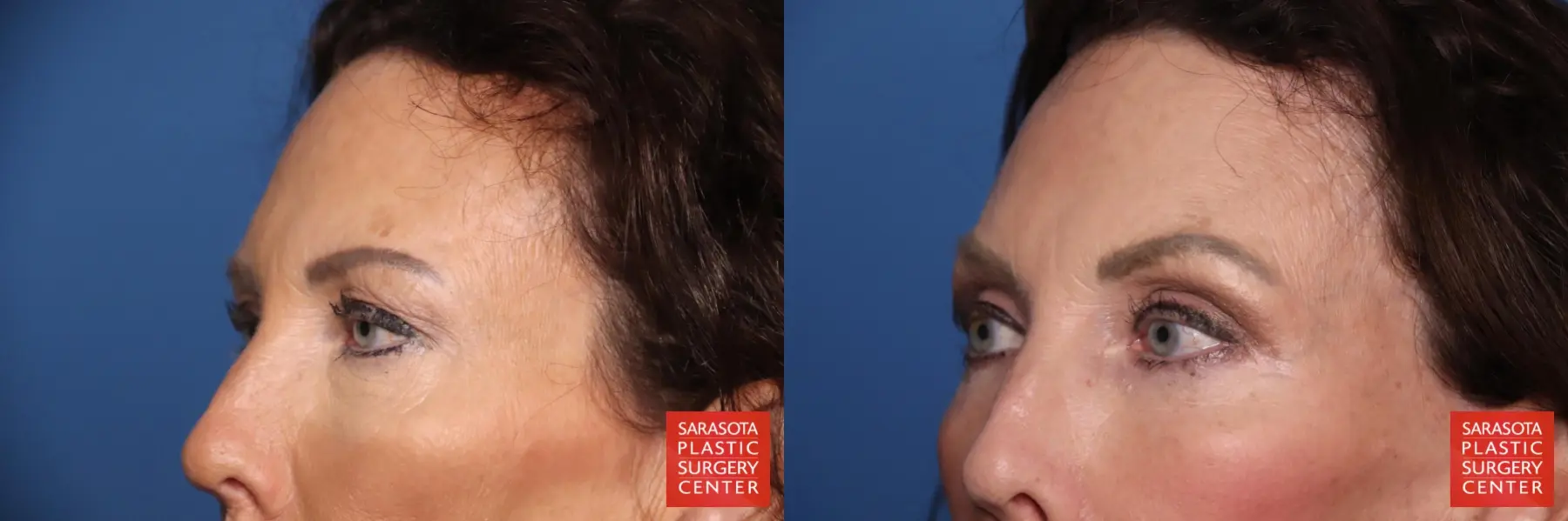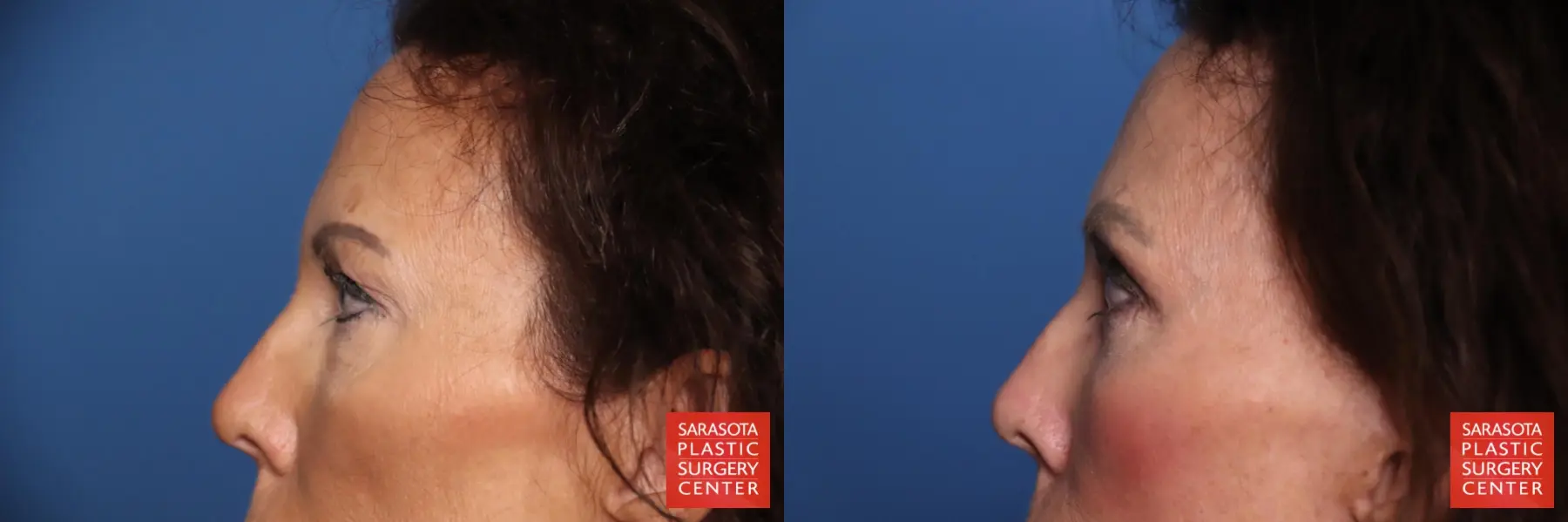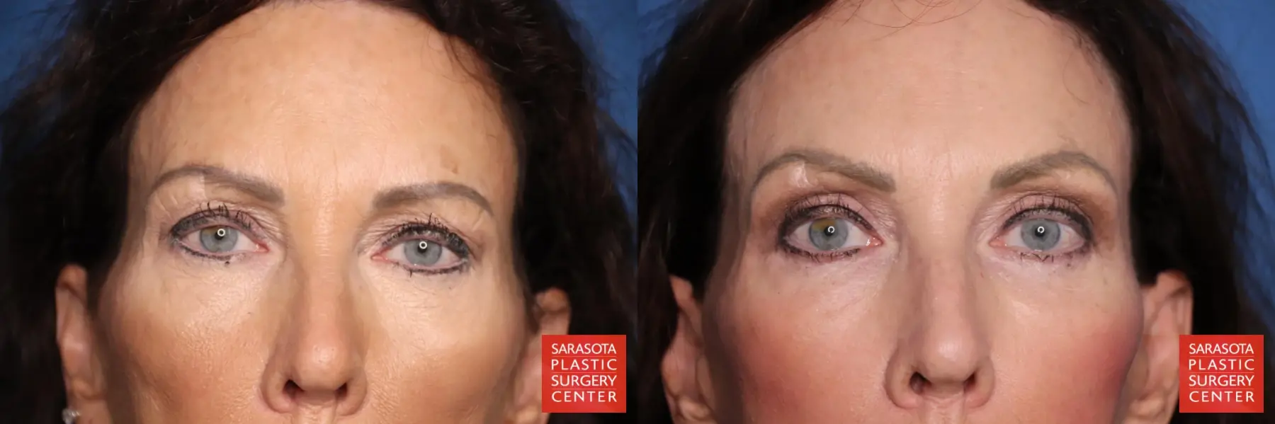 60-year-old female that was concerned with her general face. She chose to undergo a facelift, upper and lower eyelid blepharoplasty, fat grafting to cheeks, lateral brow, upper/lower lip, marionette lines, nasolabial folds, tear troughs, temples and FX CO2 laser to the central face.