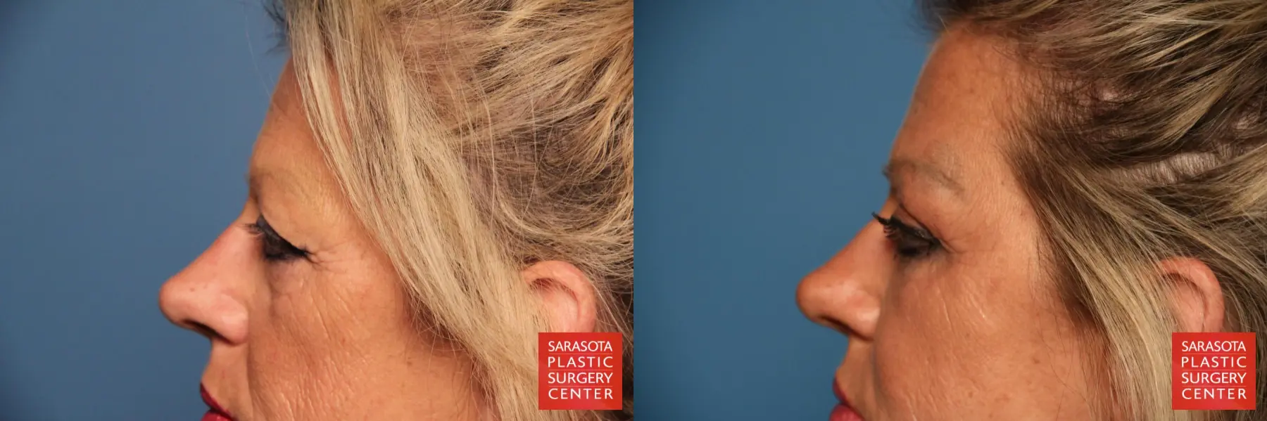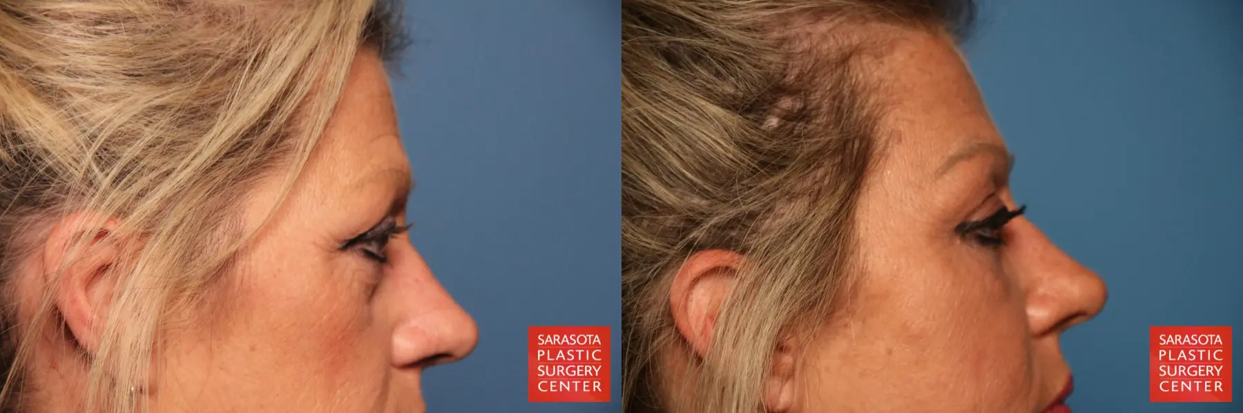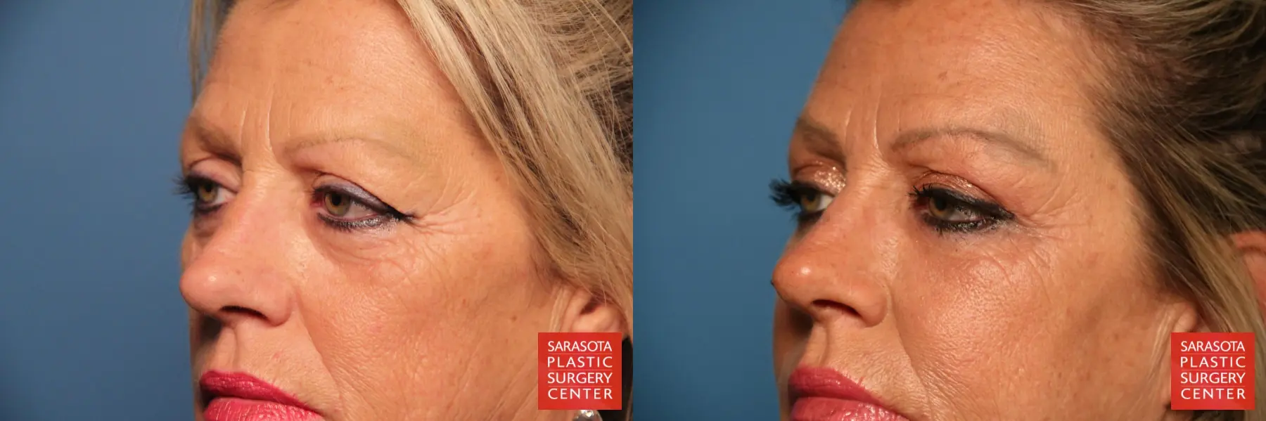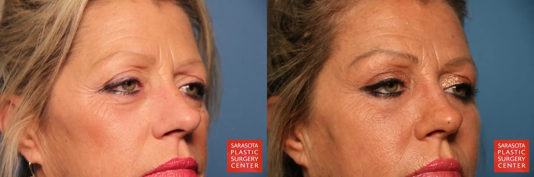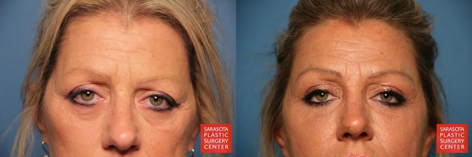 50-year-old female that was concerned with her facial and periorbital aging. She chose to undergo a bilateral upper and lower eyelid blepharoplasty with fat grafting to cheeks, infraorbital rim, malar mounds, nasolabial folds and submalar regions and a temporal browlift.