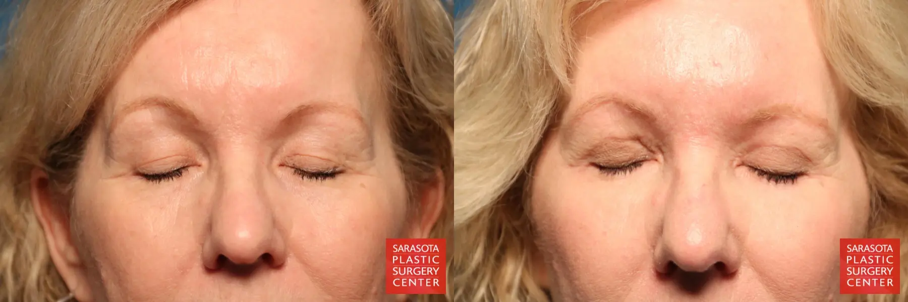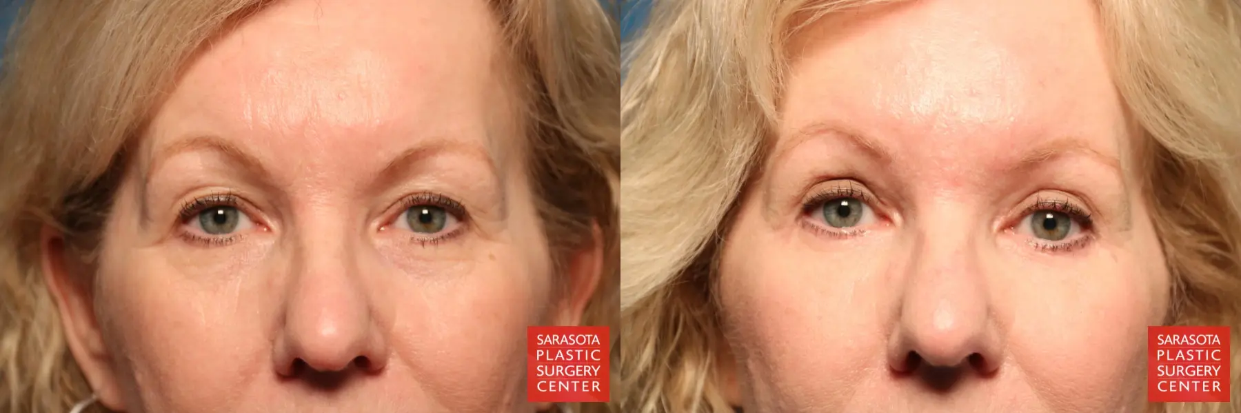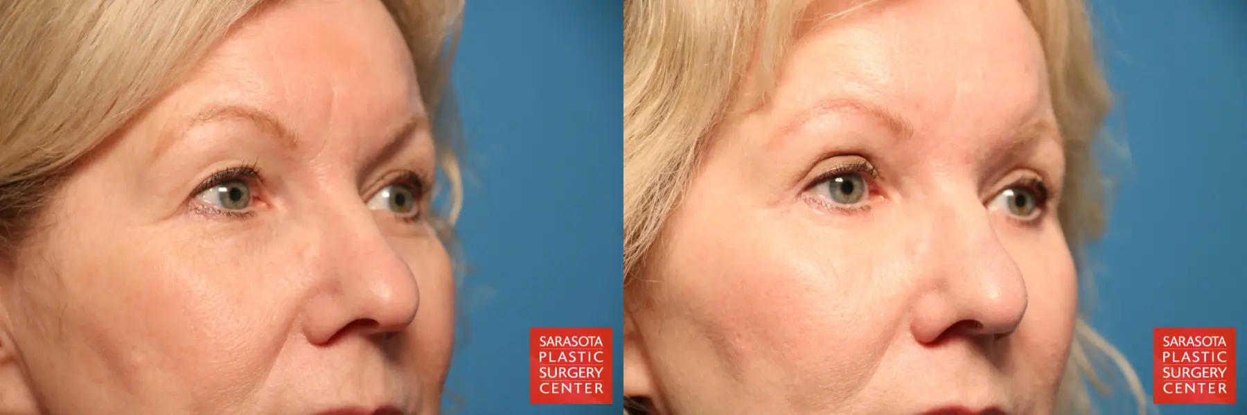 61-year-old female that was concerned with the excess skin of her upper and lower eyelids, fat excess of the lower eyelids, eyelid hooding and crowsfeet. She chose to undergo lower eyelid blepharoplasty-subciliary, upper eyelid blepharoplasty with transpalpebral corrugator resection and fat grafting.