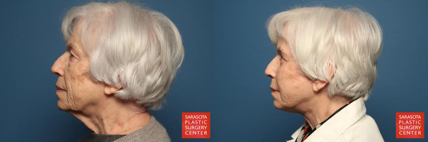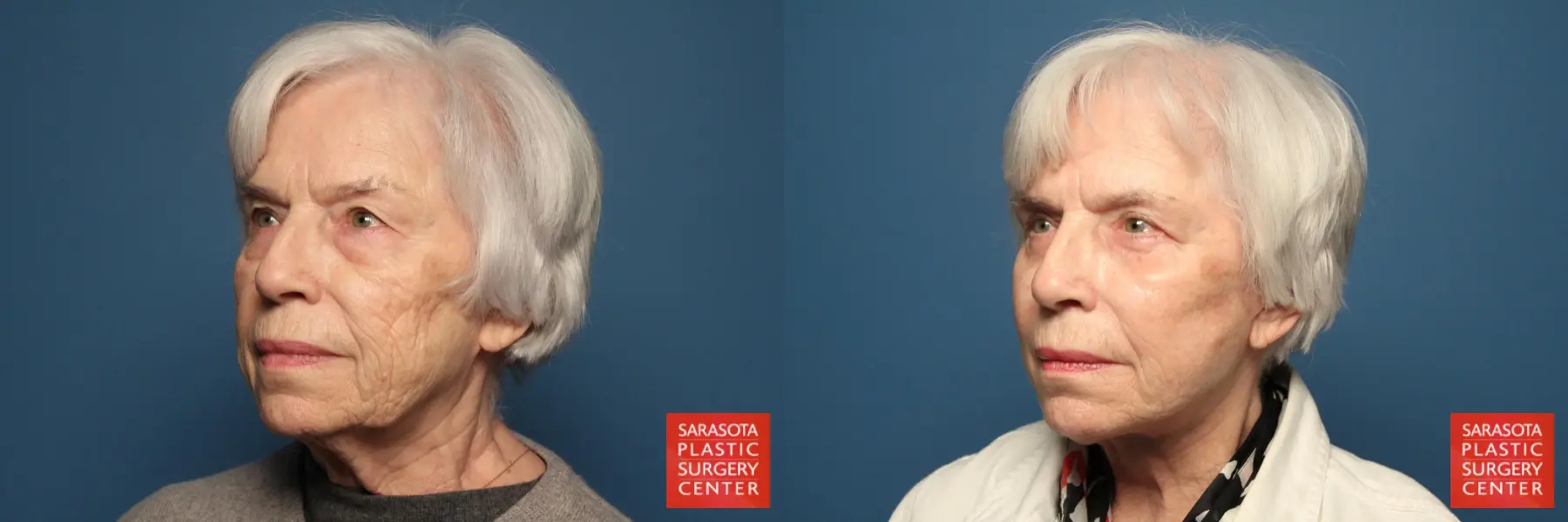 81 year old female that was concerned with her aged and tired appearance, sagging jowls, excess skin, marionette lines and nasolabial folds. She chose to undergo a facelift, bilateral upper and lower blepharoplasty and fat injections to the face.