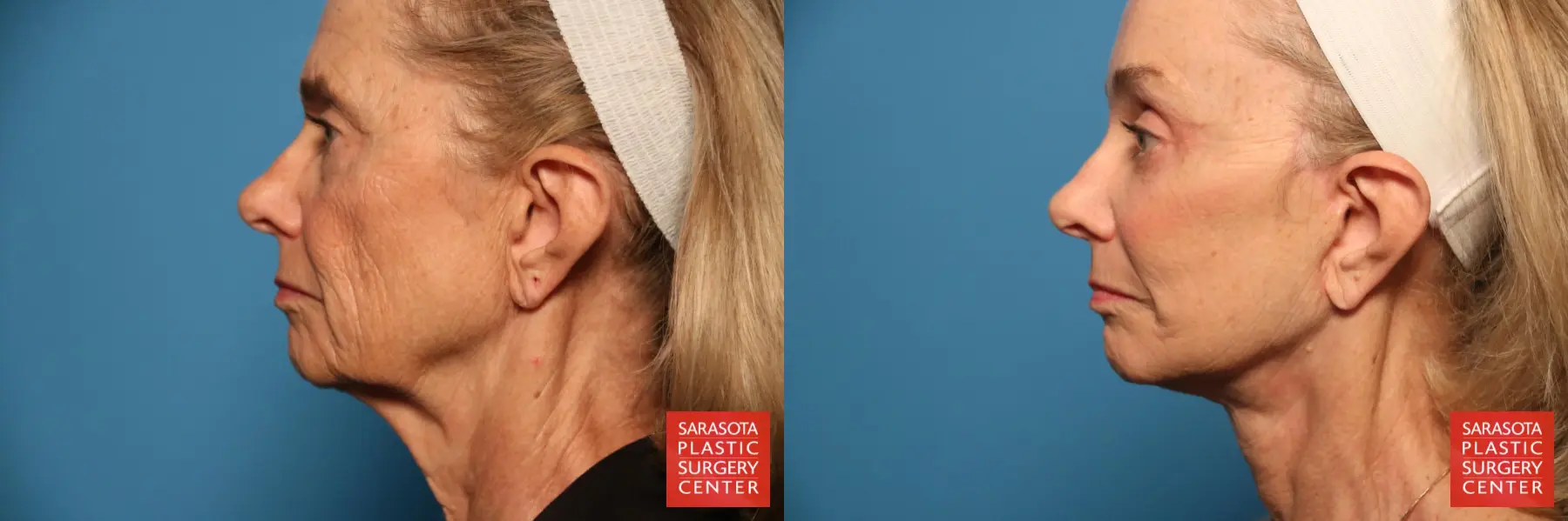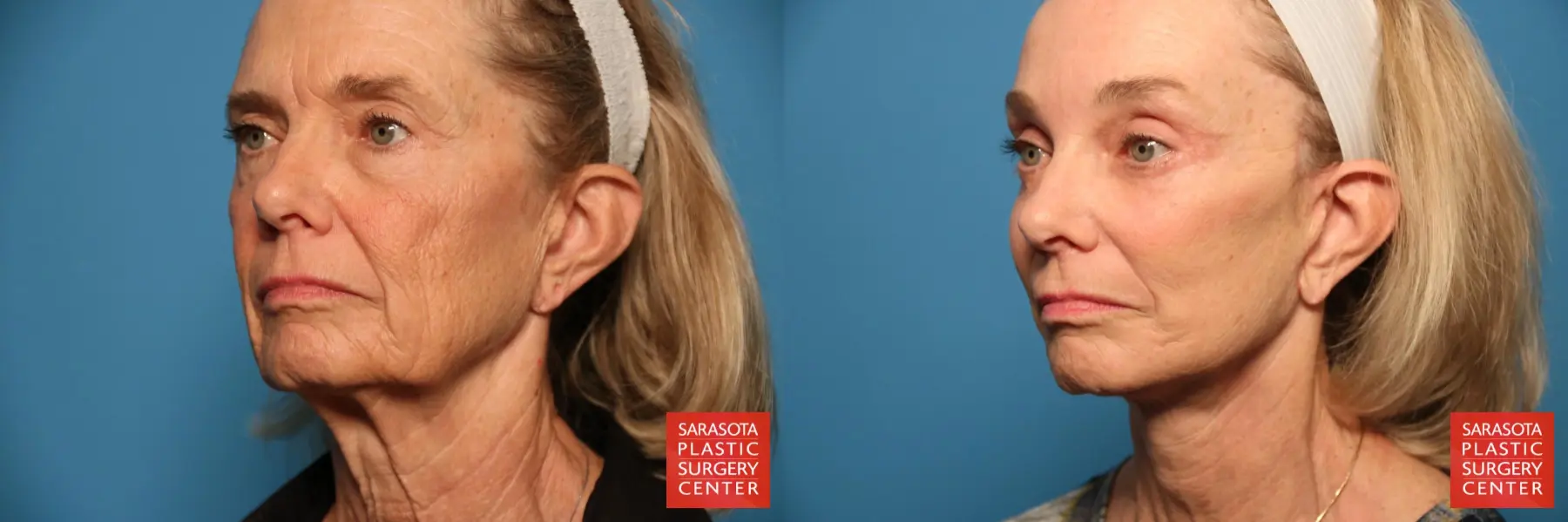 68-year-old female that was concerned with her aging face. Following a detailed consultation of her options she chose to proceed with a facelift, coronal browlift, fat grafting to face and lower eyelid blepharoplasty – subciliary.