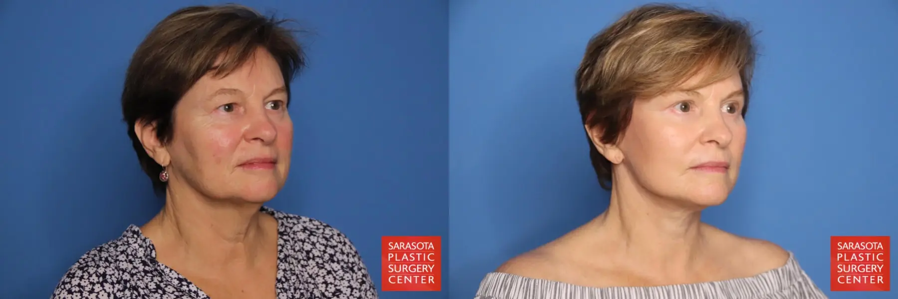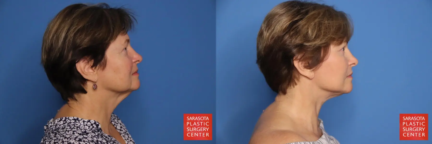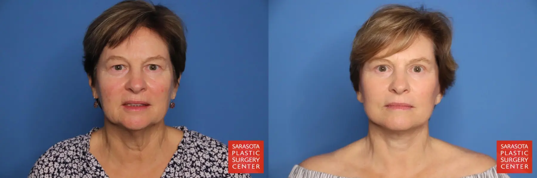 63-year-old female that was concerned with her general face and neck. She chose to undergo a facelift, upper and lower eyelid blepharoplasty, FX CO2 laser to central face, fat grafting to cheeks, lateral brow, upper/lower lip, marionette lines, nasolabial folds, sublabial crease, submental crease, tear troughs and temples.