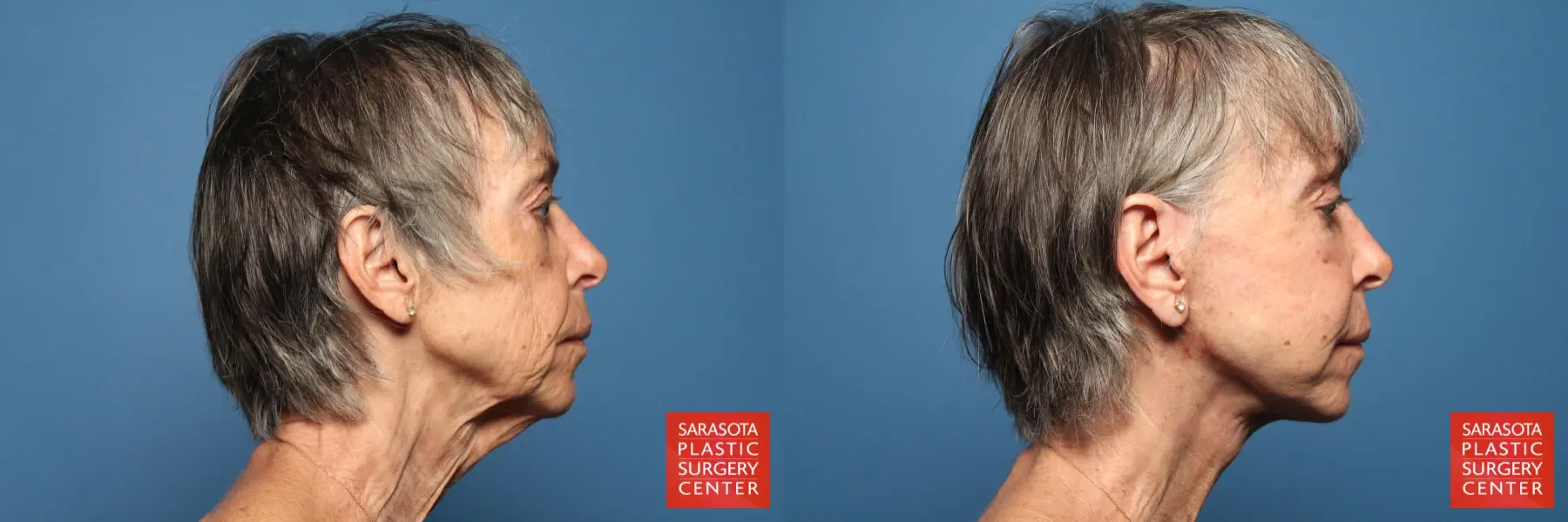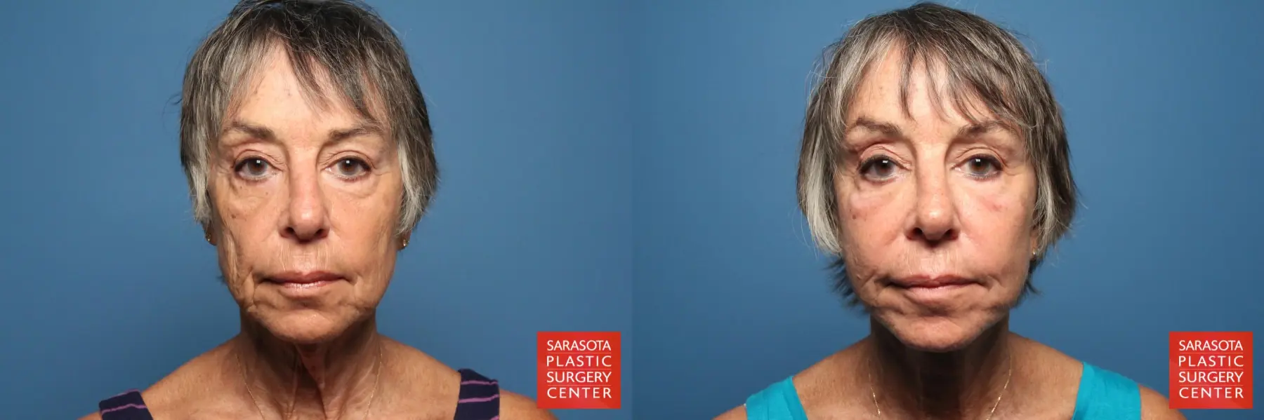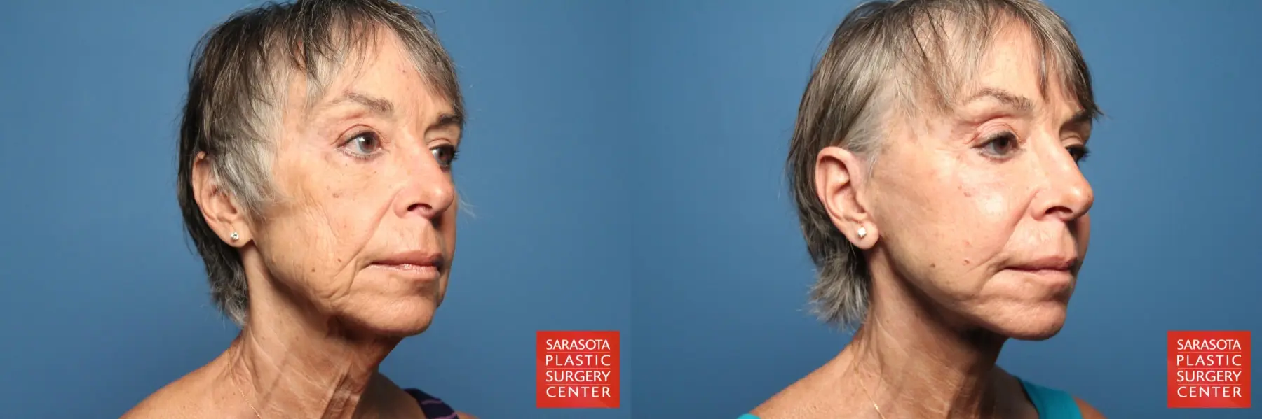 67 year old female that was concerned with her gerneral face and neck chose to undergo a facelift with fat grafting to the cheeks, lateral brow, lower eyelids, malar mounds, nasolabial folds and temples.