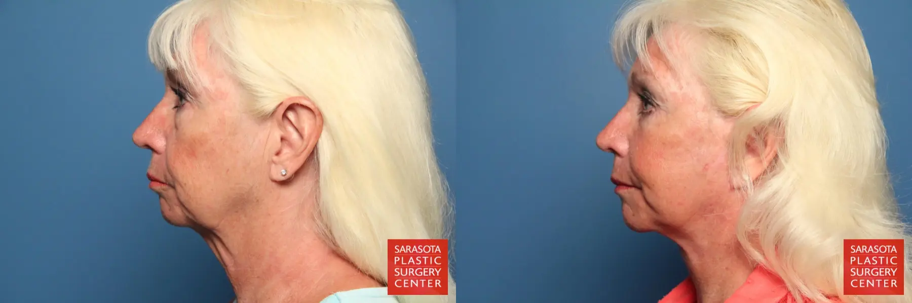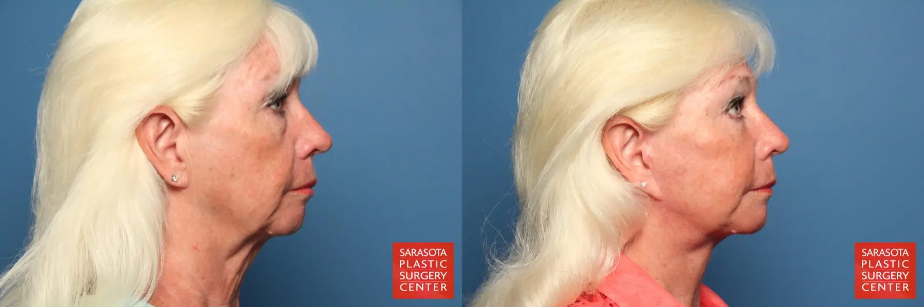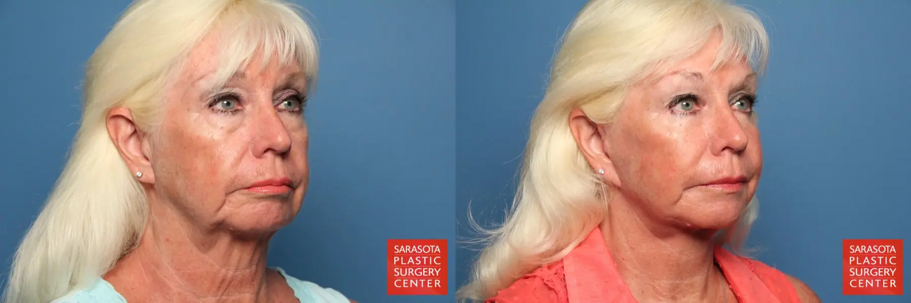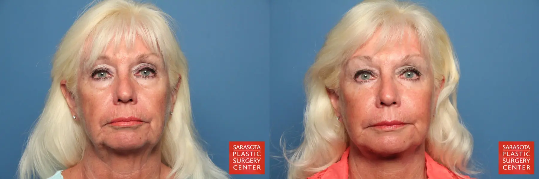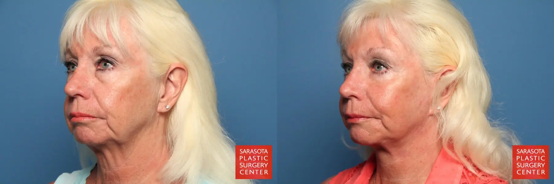 65 year old female that was concerned with her aged appearance, chose to undergo a facelift, lower eyelid blepharoplasty with fat grafting to the cheeks, lateral brow, lower eyelids, malar mounds, marionette lines, nasolabial folds and oral commisure areas.