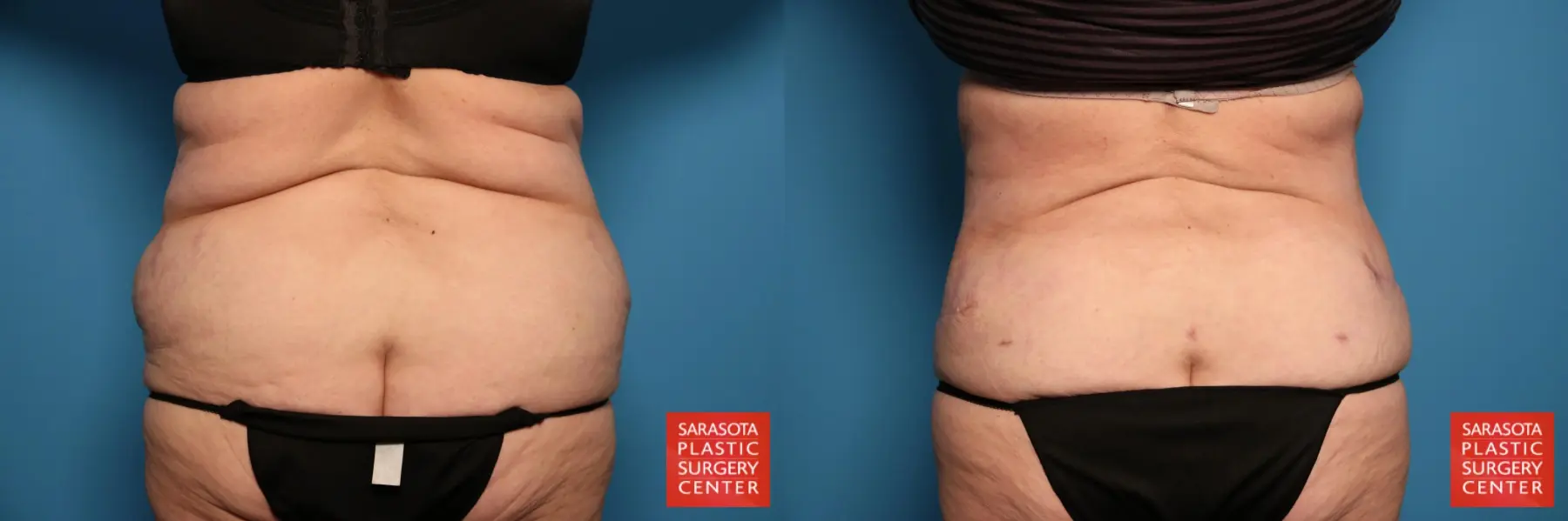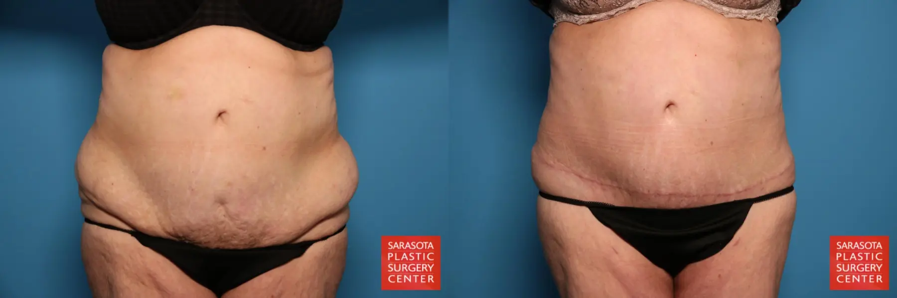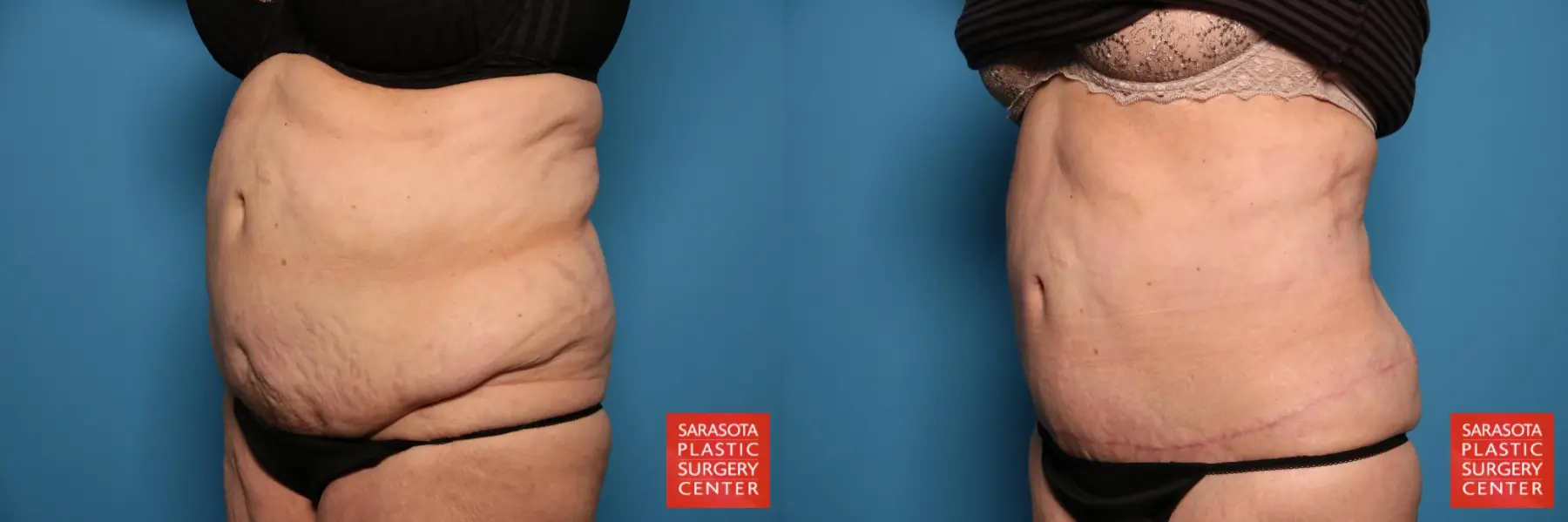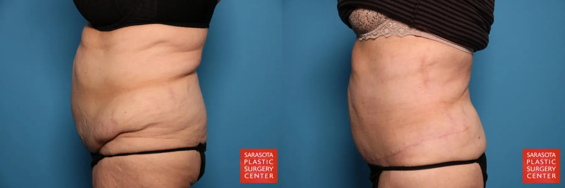 This 68-year-old female had a tummy tuck years ago and was bothered by “glops” of tissue along her lower lateral abdominal wall and inner thighs. Not desiring a redo tummy tuck she wanted improved contour in her clothing. She is now 3 months out from liposuction to her flanks, full abdomen, medial thighs and excision of abdominal rolls. She is “so, so happy” with her result.